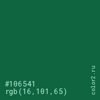 Цвет #106541 в цветовой модели RGB обозначается тремя октетами (16, 101, 65) в десятичном формате и #106541 в шестнадцатиричном (hex) формате, которые являются интенсивностью красного 16 (hex 10), интенсивность зелёного 101 (hex 65) и интенсивность синего 65 (hex 41).