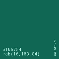 Цвет #106754 в цветовой модели RGB обозначается тремя октетами (16, 103, 84) в десятичном формате и #106754 в шестнадцатиричном (hex) формате, которые являются интенсивностью красного 16 (hex 10), интенсивность зелёного 103 (hex 67) и интенсивность синего 84 (hex 54).