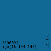 Цвет #106894 в цветовой модели RGB обозначается тремя октетами (16, 104, 148) в десятичном формате и #106894 в шестнадцатиричном (hex) формате, которые являются интенсивностью красного 16 (hex 10), интенсивность зелёного 104 (hex 68) и интенсивность синего 148 (hex 94).