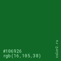 Цвет #106926 в цветовой модели RGB обозначается тремя октетами (16, 105, 38) в десятичном формате и #106926 в шестнадцатиричном (hex) формате, которые являются интенсивностью красного 16 (hex 10), интенсивность зелёного 105 (hex 69) и интенсивность синего 38 (hex 26).