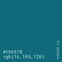 Цвет #106978 в цветовой модели RGB обозначается тремя октетами (16, 105, 120) в десятичном формате и #106978 в шестнадцатиричном (hex) формате, которые являются интенсивностью красного 16 (hex 10), интенсивность зелёного 105 (hex 69) и интенсивность синего 120 (hex 78).