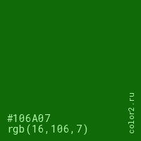 Цвет #106A07 в цветовой модели RGB обозначается тремя октетами (16, 106, 7) в десятичном формате и #106A07 в шестнадцатиричном (hex) формате, которые являются интенсивностью красного 16 (hex 10), интенсивность зелёного 106 (hex 6A) и интенсивность синего 7 (hex 07).