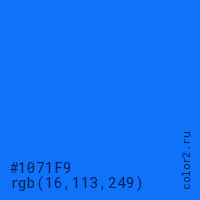 Цвет #1071F9 в цветовой модели RGB обозначается тремя октетами (16, 113, 249) в десятичном формате и #1071F9 в шестнадцатиричном (hex) формате, которые являются интенсивностью красного 16 (hex 10), интенсивность зелёного 113 (hex 71) и интенсивность синего 249 (hex F9).