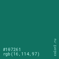 Цвет #107261 в цветовой модели RGB обозначается тремя октетами (16, 114, 97) в десятичном формате и #107261 в шестнадцатиричном (hex) формате, которые являются интенсивностью красного 16 (hex 10), интенсивность зелёного 114 (hex 72) и интенсивность синего 97 (hex 61).