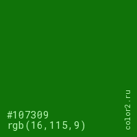 Цвет #107309 в цветовой модели RGB обозначается тремя октетами (16, 115, 9) в десятичном формате и #107309 в шестнадцатиричном (hex) формате, которые являются интенсивностью красного 16 (hex 10), интенсивность зелёного 115 (hex 73) и интенсивность синего 9 (hex 09).