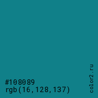 Цвет #108089 в цветовой модели RGB обозначается тремя октетами (16, 128, 137) в десятичном формате и #108089 в шестнадцатиричном (hex) формате, которые являются интенсивностью красного 16 (hex 10), интенсивность зелёного 128 (hex 80) и интенсивность синего 137 (hex 89).