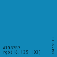 Цвет #1087B7 в цветовой модели RGB обозначается тремя октетами (16, 135, 183) в десятичном формате и #1087B7 в шестнадцатиричном (hex) формате, которые являются интенсивностью красного 16 (hex 10), интенсивность зелёного 135 (hex 87) и интенсивность синего 183 (hex B7).