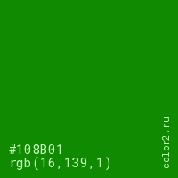 Цвет #108B01 в цветовой модели RGB обозначается тремя октетами (16, 139, 1) в десятичном формате и #108B01 в шестнадцатиричном (hex) формате, которые являются интенсивностью красного 16 (hex 10), интенсивность зелёного 139 (hex 8B) и интенсивность синего 1 (hex 01).