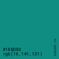 Цвет #108D83 в цветовой модели RGB обозначается тремя октетами (16, 141, 131) в десятичном формате и #108D83 в шестнадцатиричном (hex) формате, которые являются интенсивностью красного 16 (hex 10), интенсивность зелёного 141 (hex 8D) и интенсивность синего 131 (hex 83).