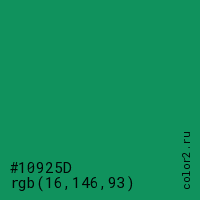 Цвет #10925D в цветовой модели RGB обозначается тремя октетами (16, 146, 93) в десятичном формате и #10925D в шестнадцатиричном (hex) формате, которые являются интенсивностью красного 16 (hex 10), интенсивность зелёного 146 (hex 92) и интенсивность синего 93 (hex 5D).