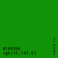 Цвет #109306 в цветовой модели RGB обозначается тремя октетами (16, 147, 6) в десятичном формате и #109306 в шестнадцатиричном (hex) формате, которые являются интенсивностью красного 16 (hex 10), интенсивность зелёного 147 (hex 93) и интенсивность синего 6 (hex 06).