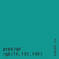 Цвет #10978F в цветовой модели RGB обозначается тремя октетами (16, 151, 143) в десятичном формате и #10978F в шестнадцатиричном (hex) формате, которые являются интенсивностью красного 16 (hex 10), интенсивность зелёного 151 (hex 97) и интенсивность синего 143 (hex 8F).