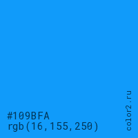 Цвет #109BFA в цветовой модели RGB обозначается тремя октетами (16, 155, 250) в десятичном формате и #109BFA в шестнадцатиричном (hex) формате, которые являются интенсивностью красного 16 (hex 10), интенсивность зелёного 155 (hex 9B) и интенсивность синего 250 (hex FA).