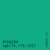 Цвет #10AC84 в цветовой модели RGB обозначается тремя октетами (16, 172, 132) в десятичном формате и #10AC84 в шестнадцатиричном (hex) формате, которые являются интенсивностью красного 16 (hex 10), интенсивность зелёного 172 (hex AC) и интенсивность синего 132 (hex 84).