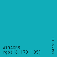 Цвет #10ADB9 в цветовой модели RGB обозначается тремя октетами (16, 173, 185) в десятичном формате и #10ADB9 в шестнадцатиричном (hex) формате, которые являются интенсивностью красного 16 (hex 10), интенсивность зелёного 173 (hex AD) и интенсивность синего 185 (hex B9).