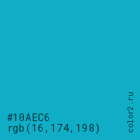 Цвет #10AEC6 в цветовой модели RGB обозначается тремя октетами (16, 174, 198) в десятичном формате и #10AEC6 в шестнадцатиричном (hex) формате, которые являются интенсивностью красного 16 (hex 10), интенсивность зелёного 174 (hex AE) и интенсивность синего 198 (hex C6).