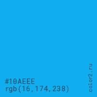 Цвет #10AEEE в цветовой модели RGB обозначается тремя октетами (16, 174, 238) в десятичном формате и #10AEEE в шестнадцатиричном (hex) формате, которые являются интенсивностью красного 16 (hex 10), интенсивность зелёного 174 (hex AE) и интенсивность синего 238 (hex EE).