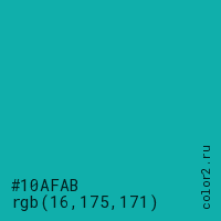 Цвет #10AFAB в цветовой модели RGB обозначается тремя октетами (16, 175, 171) в десятичном формате и #10AFAB в шестнадцатиричном (hex) формате, которые являются интенсивностью красного 16 (hex 10), интенсивность зелёного 175 (hex AF) и интенсивность синего 171 (hex AB).