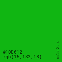 Цвет #10B612 в цветовой модели RGB обозначается тремя октетами (16, 182, 18) в десятичном формате и #10B612 в шестнадцатиричном (hex) формате, которые являются интенсивностью красного 16 (hex 10), интенсивность зелёного 182 (hex B6) и интенсивность синего 18 (hex 12).