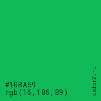 Цвет #10BA59 в цветовой модели RGB обозначается тремя октетами (16, 186, 89) в десятичном формате и #10BA59 в шестнадцатиричном (hex) формате, которые являются интенсивностью красного 16 (hex 10), интенсивность зелёного 186 (hex BA) и интенсивность синего 89 (hex 59).