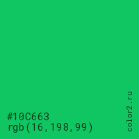 Цвет #10C663 в цветовой модели RGB обозначается тремя октетами (16, 198, 99) в десятичном формате и #10C663 в шестнадцатиричном (hex) формате, которые являются интенсивностью красного 16 (hex 10), интенсивность зелёного 198 (hex C6) и интенсивность синего 99 (hex 63).
