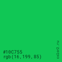 Цвет #10C755 в цветовой модели RGB обозначается тремя октетами (16, 199, 85) в десятичном формате и #10C755 в шестнадцатиричном (hex) формате, которые являются интенсивностью красного 16 (hex 10), интенсивность зелёного 199 (hex C7) и интенсивность синего 85 (hex 55).