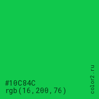 Цвет #10C84C в цветовой модели RGB обозначается тремя октетами (16, 200, 76) в десятичном формате и #10C84C в шестнадцатиричном (hex) формате, которые являются интенсивностью красного 16 (hex 10), интенсивность зелёного 200 (hex C8) и интенсивность синего 76 (hex 4C).
