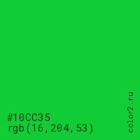 Цвет #10CC35 в цветовой модели RGB обозначается тремя октетами (16, 204, 53) в десятичном формате и #10CC35 в шестнадцатиричном (hex) формате, которые являются интенсивностью красного 16 (hex 10), интенсивность зелёного 204 (hex CC) и интенсивность синего 53 (hex 35).