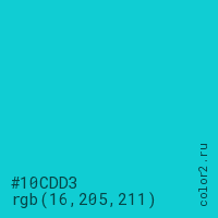 Цвет #10CDD3 в цветовой модели RGB обозначается тремя октетами (16, 205, 211) в десятичном формате и #10CDD3 в шестнадцатиричном (hex) формате, которые являются интенсивностью красного 16 (hex 10), интенсивность зелёного 205 (hex CD) и интенсивность синего 211 (hex D3).