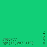 Цвет #10CF77 в цветовой модели RGB обозначается тремя октетами (16, 207, 119) в десятичном формате и #10CF77 в шестнадцатиричном (hex) формате, которые являются интенсивностью красного 16 (hex 10), интенсивность зелёного 207 (hex CF) и интенсивность синего 119 (hex 77).