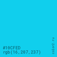 Цвет #10CFED в цветовой модели RGB обозначается тремя октетами (16, 207, 237) в десятичном формате и #10CFED в шестнадцатиричном (hex) формате, которые являются интенсивностью красного 16 (hex 10), интенсивность зелёного 207 (hex CF) и интенсивность синего 237 (hex ED).