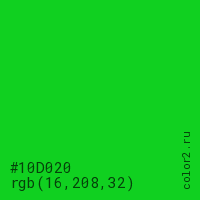 Цвет #10D020 в цветовой модели RGB обозначается тремя октетами (16, 208, 32) в десятичном формате и #10D020 в шестнадцатиричном (hex) формате, которые являются интенсивностью красного 16 (hex 10), интенсивность зелёного 208 (hex D0) и интенсивность синего 32 (hex 20).