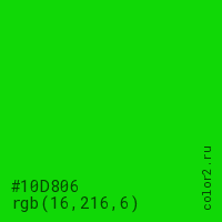 Цвет #10D806 в цветовой модели RGB обозначается тремя октетами (16, 216, 6) в десятичном формате и #10D806 в шестнадцатиричном (hex) формате, которые являются интенсивностью красного 16 (hex 10), интенсивность зелёного 216 (hex D8) и интенсивность синего 6 (hex 06).
