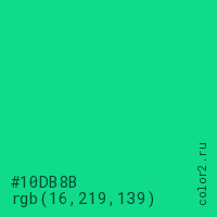 Цвет #10DB8B в цветовой модели RGB обозначается тремя октетами (16, 219, 139) в десятичном формате и #10DB8B в шестнадцатиричном (hex) формате, которые являются интенсивностью красного 16 (hex 10), интенсивность зелёного 219 (hex DB) и интенсивность синего 139 (hex 8B).