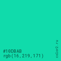 Цвет #10DBAB в цветовой модели RGB обозначается тремя октетами (16, 219, 171) в десятичном формате и #10DBAB в шестнадцатиричном (hex) формате, которые являются интенсивностью красного 16 (hex 10), интенсивность зелёного 219 (hex DB) и интенсивность синего 171 (hex AB).