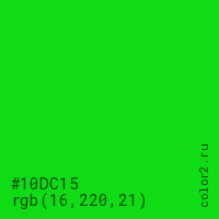 Цвет #10DC15 в цветовой модели RGB обозначается тремя октетами (16, 220, 21) в десятичном формате и #10DC15 в шестнадцатиричном (hex) формате, которые являются интенсивностью красного 16 (hex 10), интенсивность зелёного 220 (hex DC) и интенсивность синего 21 (hex 15).