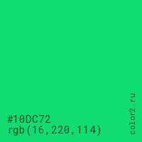 Цвет #10DC72 в цветовой модели RGB обозначается тремя октетами (16, 220, 114) в десятичном формате и #10DC72 в шестнадцатиричном (hex) формате, которые являются интенсивностью красного 16 (hex 10), интенсивность зелёного 220 (hex DC) и интенсивность синего 114 (hex 72).