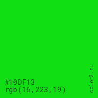 Цвет #10DF13 в цветовой модели RGB обозначается тремя октетами (16, 223, 19) в десятичном формате и #10DF13 в шестнадцатиричном (hex) формате, которые являются интенсивностью красного 16 (hex 10), интенсивность зелёного 223 (hex DF) и интенсивность синего 19 (hex 13).