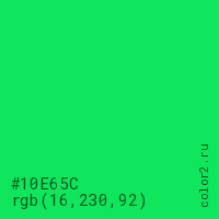 Цвет #10E65C в цветовой модели RGB обозначается тремя октетами (16, 230, 92) в десятичном формате и #10E65C в шестнадцатиричном (hex) формате, которые являются интенсивностью красного 16 (hex 10), интенсивность зелёного 230 (hex E6) и интенсивность синего 92 (hex 5C).