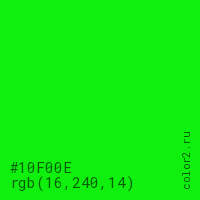 Цвет #10F00E в цветовой модели RGB обозначается тремя октетами (16, 240, 14) в десятичном формате и #10F00E в шестнадцатиричном (hex) формате, которые являются интенсивностью красного 16 (hex 10), интенсивность зелёного 240 (hex F0) и интенсивность синего 14 (hex 0E).