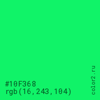 Цвет #10F368 в цветовой модели RGB обозначается тремя октетами (16, 243, 104) в десятичном формате и #10F368 в шестнадцатиричном (hex) формате, которые являются интенсивностью красного 16 (hex 10), интенсивность зелёного 243 (hex F3) и интенсивность синего 104 (hex 68).