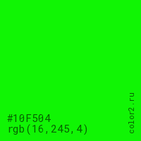 Цвет #10F504 в цветовой модели RGB обозначается тремя октетами (16, 245, 4) в десятичном формате и #10F504 в шестнадцатиричном (hex) формате, которые являются интенсивностью красного 16 (hex 10), интенсивность зелёного 245 (hex F5) и интенсивность синего 4 (hex 04).