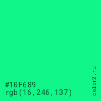 Цвет #10F689 в цветовой модели RGB обозначается тремя октетами (16, 246, 137) в десятичном формате и #10F689 в шестнадцатиричном (hex) формате, которые являются интенсивностью красного 16 (hex 10), интенсивность зелёного 246 (hex F6) и интенсивность синего 137 (hex 89).