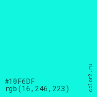 Цвет #10F6DF в цветовой модели RGB обозначается тремя октетами (16, 246, 223) в десятичном формате и #10F6DF в шестнадцатиричном (hex) формате, которые являются интенсивностью красного 16 (hex 10), интенсивность зелёного 246 (hex F6) и интенсивность синего 223 (hex DF).