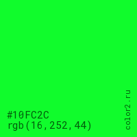 Цвет #10FC2C в цветовой модели RGB обозначается тремя октетами (16, 252, 44) в десятичном формате и #10FC2C в шестнадцатиричном (hex) формате, которые являются интенсивностью красного 16 (hex 10), интенсивность зелёного 252 (hex FC) и интенсивность синего 44 (hex 2C).