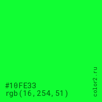 Цвет #10FE33 в цветовой модели RGB обозначается тремя октетами (16, 254, 51) в десятичном формате и #10FE33 в шестнадцатиричном (hex) формате, которые являются интенсивностью красного 16 (hex 10), интенсивность зелёного 254 (hex FE) и интенсивность синего 51 (hex 33).