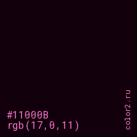 Цвет #11000B в цветовой модели RGB обозначается тремя октетами (17, 0, 11) в десятичном формате и #11000B в шестнадцатиричном (hex) формате, которые являются интенсивностью красного 17 (hex 11), интенсивность зелёного 0 (hex 00) и интенсивность синего 11 (hex 0B).