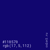 Цвет #110570 в цветовой модели RGB обозначается тремя октетами (17, 5, 112) в десятичном формате и #110570 в шестнадцатиричном (hex) формате, которые являются интенсивностью красного 17 (hex 11), интенсивность зелёного 5 (hex 05) и интенсивность синего 112 (hex 70).