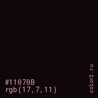 Цвет #11070B в цветовой модели RGB обозначается тремя октетами (17, 7, 11) в десятичном формате и #11070B в шестнадцатиричном (hex) формате, которые являются интенсивностью красного 17 (hex 11), интенсивность зелёного 7 (hex 07) и интенсивность синего 11 (hex 0B).