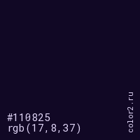 Цвет #110825 в цветовой модели RGB обозначается тремя октетами (17, 8, 37) в десятичном формате и #110825 в шестнадцатиричном (hex) формате, которые являются интенсивностью красного 17 (hex 11), интенсивность зелёного 8 (hex 08) и интенсивность синего 37 (hex 25).